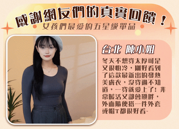 2分鐘前滋養肌膚+保暖二合一 輕薄保暖,越穿肌膚越白嫩 日本銷售排名第一【美しい肌】新秋冬美肌發熱衣 - 「新品嘗鮮八折優惠」任選1套NT$888